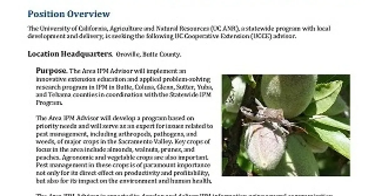 The Area IPM Advisor will develop a program based on priority needs and will serve as an expert for issues related to pest management, including arthropods, pathogens, and weeds, of major crops in the Sacramento Valley. Key crops of focus in the area include almonds, walnuts, prunes, and peaches. Agronomic and vegetable crops are also important. Pest management in these crops is of paramount importance not only for its direct effect on productivity and profitability, but also for its impact on the environment and human health.