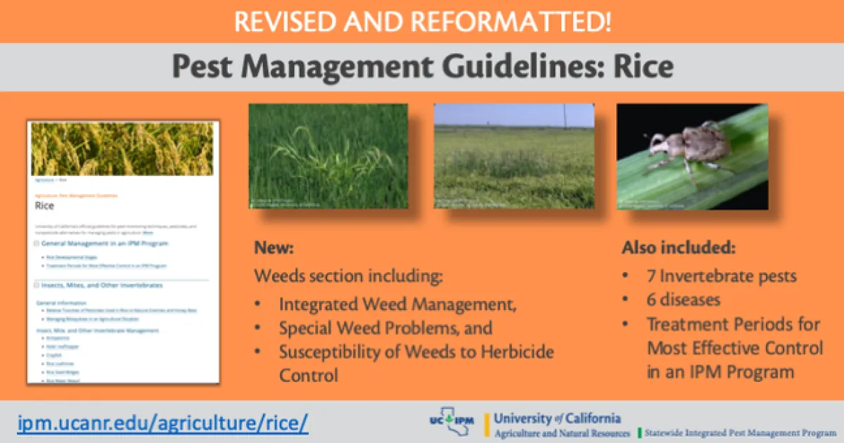 If you grow rice in California, you already know that effective weed management is not only essential for economical rice production, but also very challenging, complex, and regulated. The good news is that there is a new resource to help growers and pest control advisors with the prevention, monitoring, and control of the most common rice weeds in California. The University of California Integrated Pest Management (UC IPM) Pest Management Guidelines: Rice now includes a brand new weed management section!