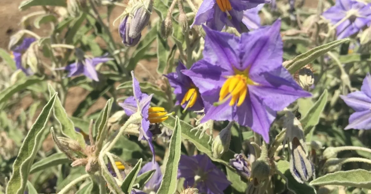 The photo below shows silverleaf nightshade spreading in a recently disked field near UC Davis. Note that it's pretty much the only plant present: it can regrow from small rhizome fragments, and is very tolerant of hot and dry conditions. It's also poisonous to livestock. It is a listed noxious weed in many states and in a number of Mediterranean-climate countries worldwide.