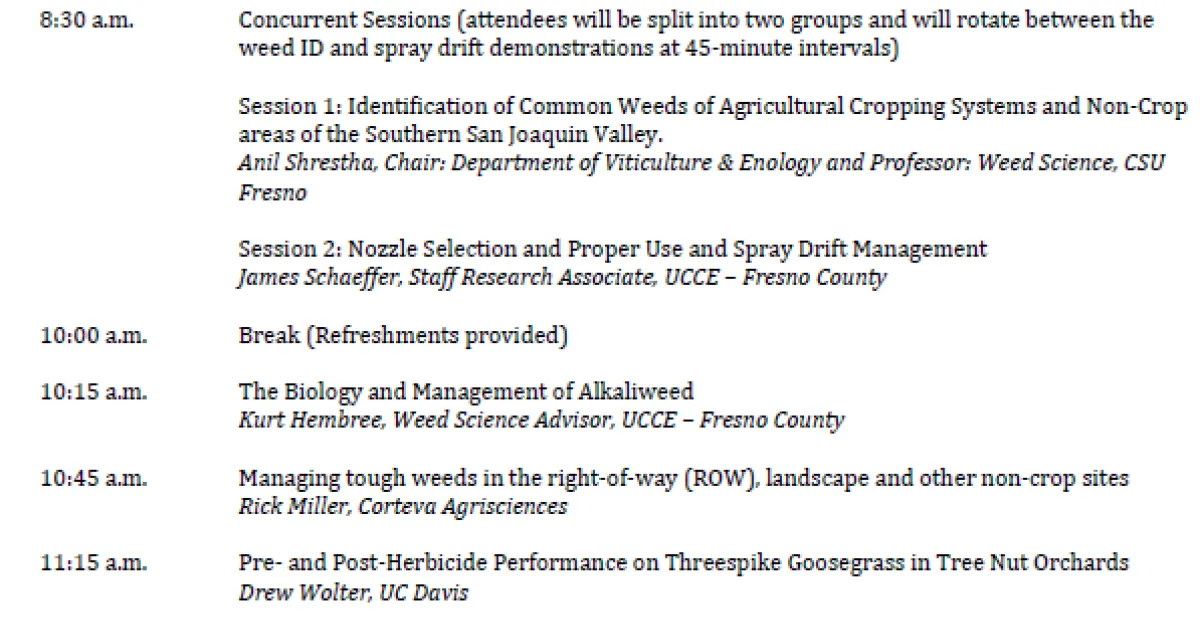 8:30 a.m. Concurrent Sessions (attendees will be split into two groups and will rotate between the weed ID and spray drift demonstrations at 45-minute intervals)