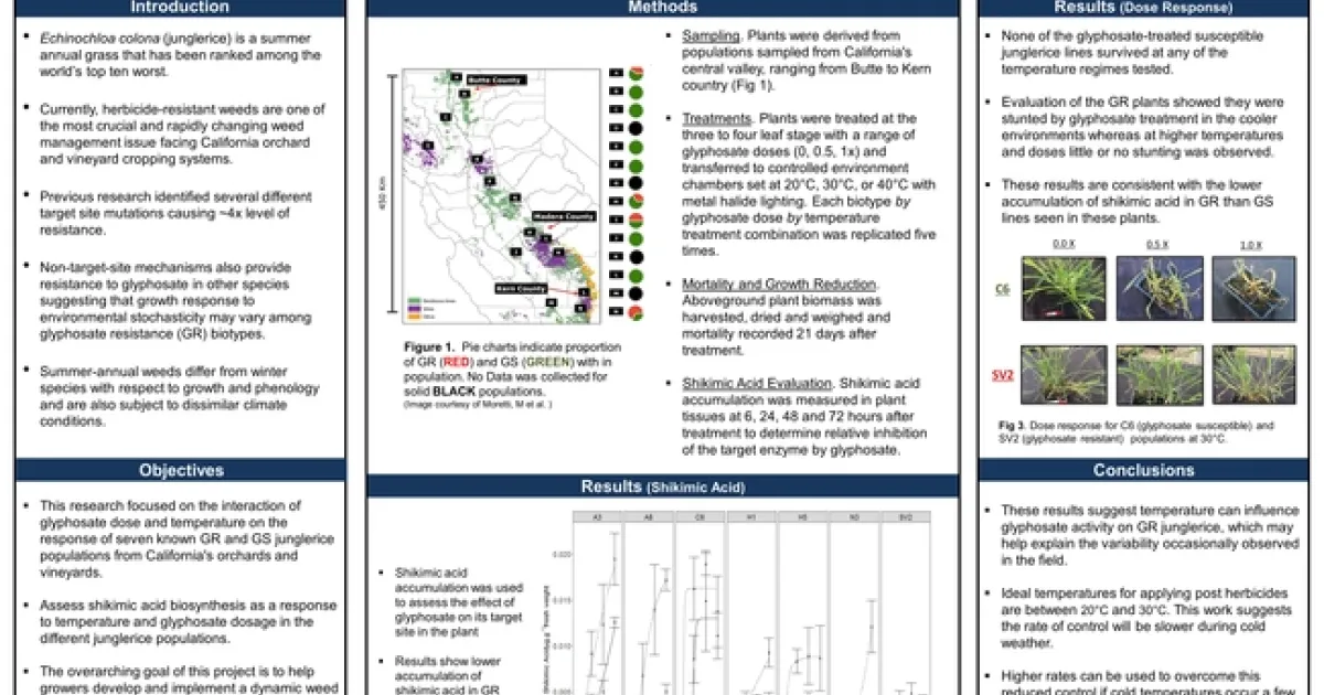 Several researchers in the UCD weed science program have been working on various aspects of glyphosate-resistant junglerice (Echinochloa colona) for the past few years.   One of our undergraduate student interns, presented a poster at the 2018 Plant and Soil Conference (the California Chapter of the American Society of Agronomy) earlier this month in Fresno.