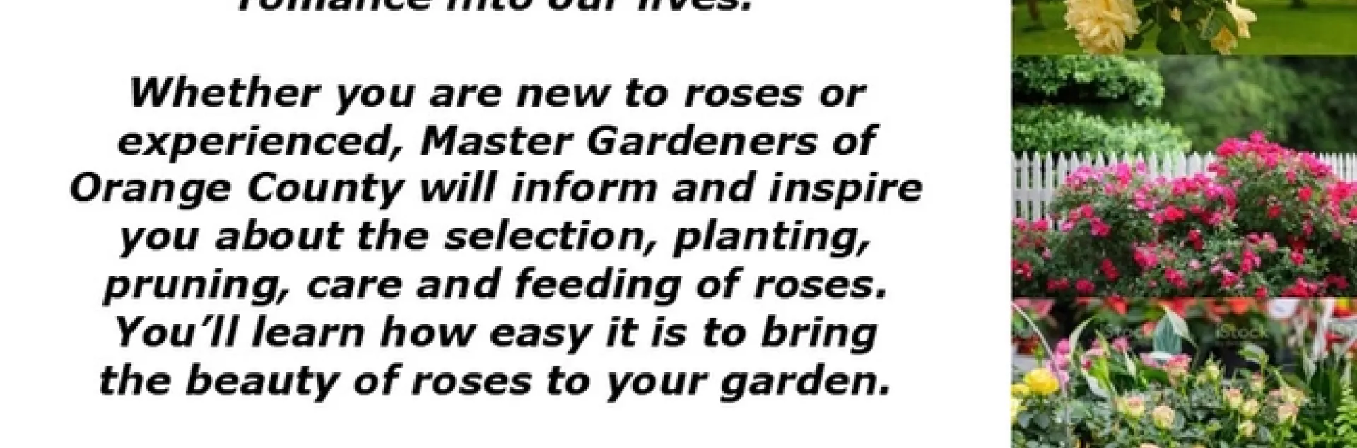 Roses bring beauty, fragrance, and romance into our lives. Whether you are new to roses or experienced, Master Gardeners of Orange County will inform and inspire you about the selection, planting, pruning, care and feeding of roses.