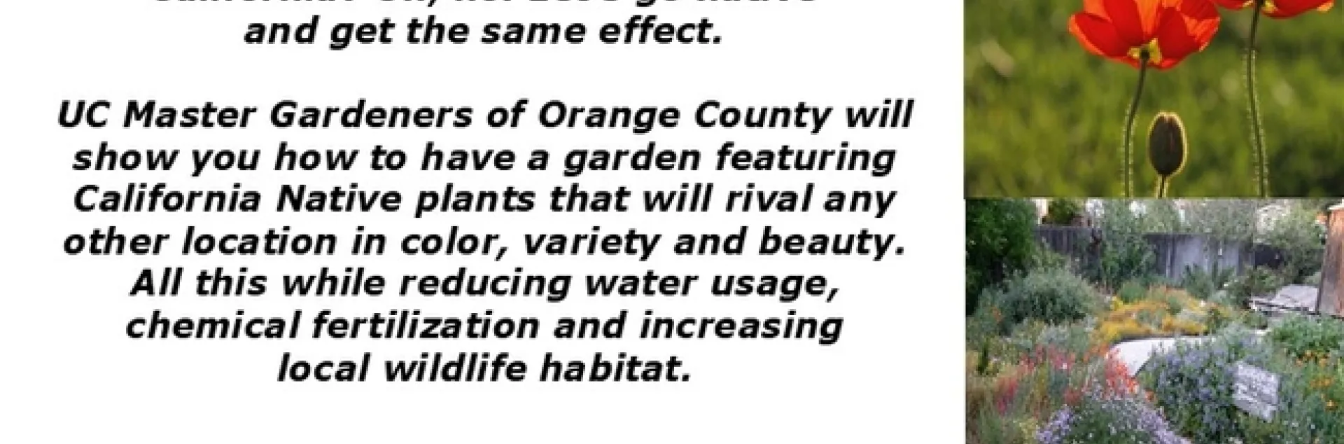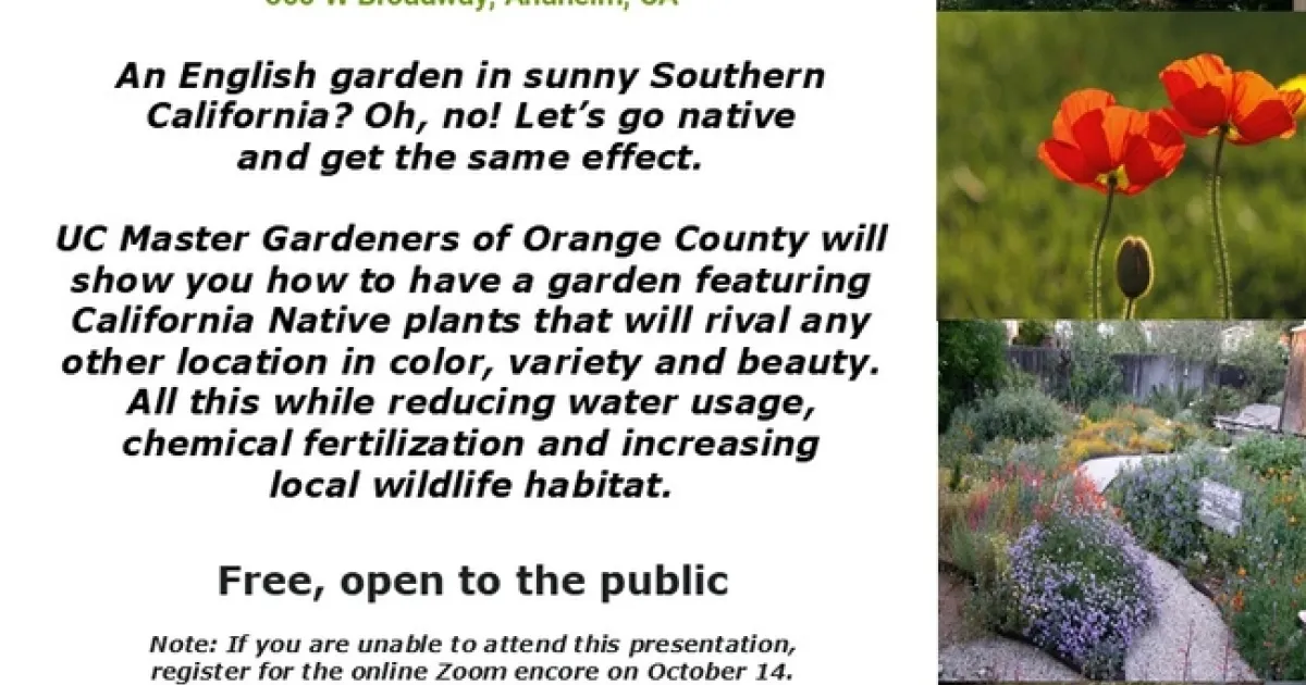 Free, open to the public. An English garden in sunny Southern California? Oh, no! Let's go native and get the same effect. We will show you how to have a garden featuring California Native plants that will rival any other location in color, variety and beauty.