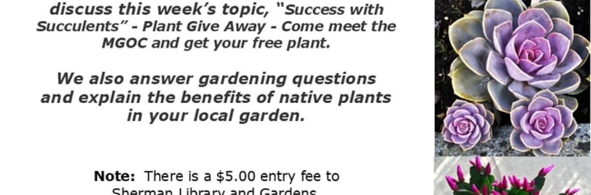 We will be on hand to discuss this week's topic, “Success with Succulents” - Plant Give Away - Come meet the MGOC and get your free plant. We also answer gardening questions and explain the benefits of native plants in your local garden.