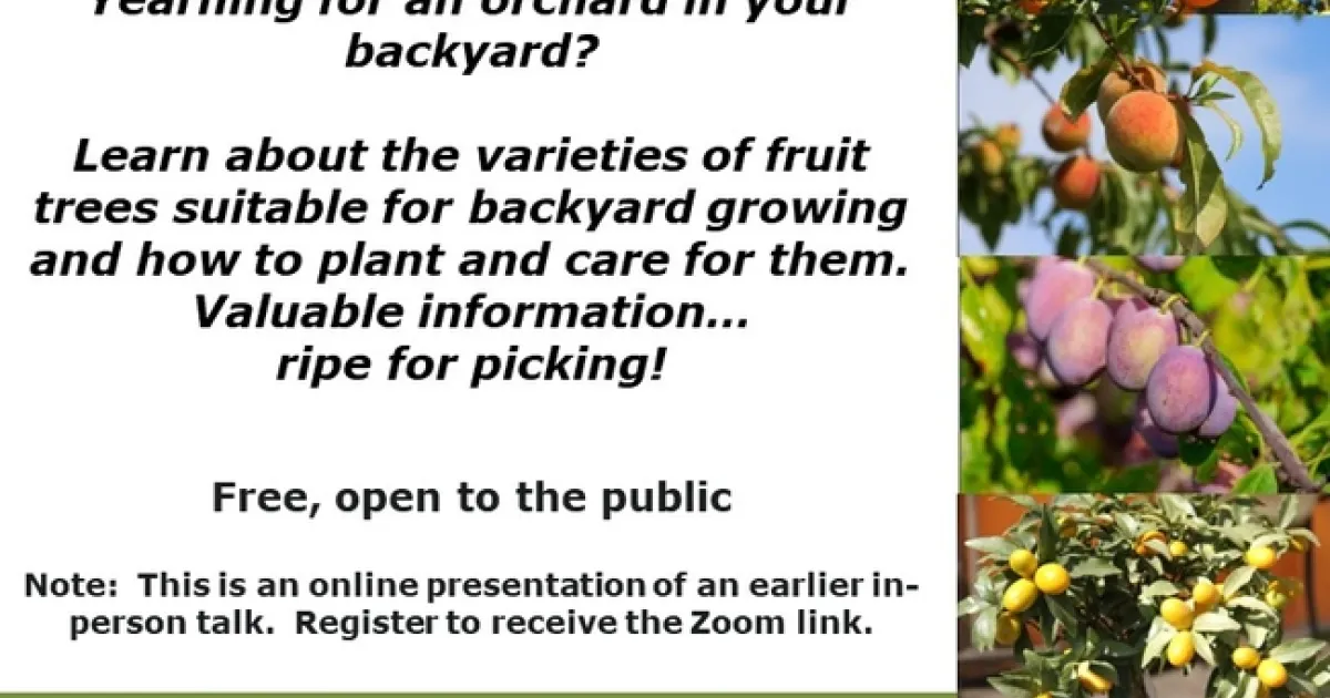 July 5, 2024 Print Yearning for an orchard in your backyard? Learn about the varieties of fruit trees suitable for backyard growing and how to plant and care for them. Click the image to learn more and visit our Classes and Events Calendar page.