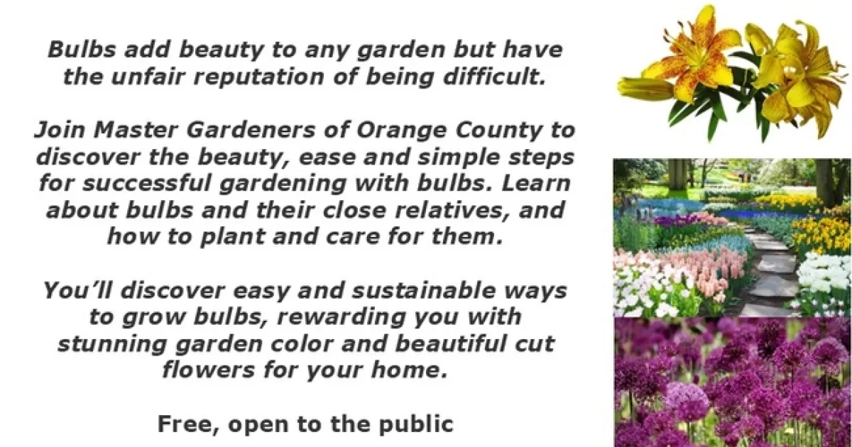 Bulbs add beauty to any garden but have the unfair reputation of being difficult. Join Master Gardeners of Orange County to discover the beauty, ease and simple steps for successful gardening with bulbs. Learn about bulbs and their close relatives, and how to plant and care for them.