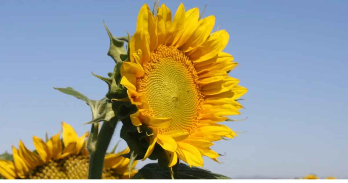 golden yellow sunflower highlighted in a field of sunflowers against the blue sky