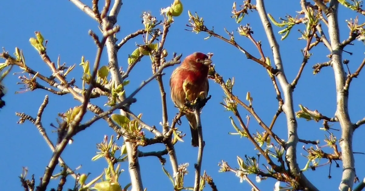 In the spring, my yard is alive with the songs of the house finch. There are often 50 or more birds fliting through the flowering pear trees (Pyrus calleryana), choosing mates and gathering nesting materials. I have to refill both bird feeders every day during that time, and go through a 30 pound bag of black oil sunflower seeds in about a week. During the summer, the activity ceases, and the bird feeders remain full for weeks at a time. I had assumed that the birds were migratory, and had left the area. However, through research I found that the house finch, while classified as migratory, usually remains in Solano County year round, but relies less on bird feeders during the summer when abundant wild plant food is available. The birds who reside in the coldest of habitats fly south to warmer climates. Foods enjoyed by the house finch include wild mustard seed (Sinapis arvensis), thistle (Cirsium arvense), mulberry (Morus spp.), poison oak (Toxicodendron diversilobum), cactus, stone fruit and berries. Their love of fruits and berries has landed them on the UC Davis Integrated Pest Management (IPM) list.