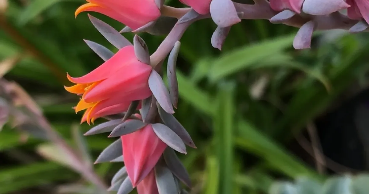 ‘Blue Waves' is a small succulent with frilly-edged leaves that are blue-green at the center of the rosette and pink on the edges. The frilly blue leaves first caught my attention and prompted my impulse buy. I had no idea at the time, however, that the flowers would be so beautiful and last so long. Plant descriptions on the internet dryly describe the flowers as “pink.” The flowers are so much more than that! They look like vibrant pink tulips with a bright orange interior. When the plant first bloomed, the flower stalks curved in a manner that formed an enchanting, loose heart shape (see photo). Ultimately, the flower stalks have reached approximately 21” and have bloomed for several months.