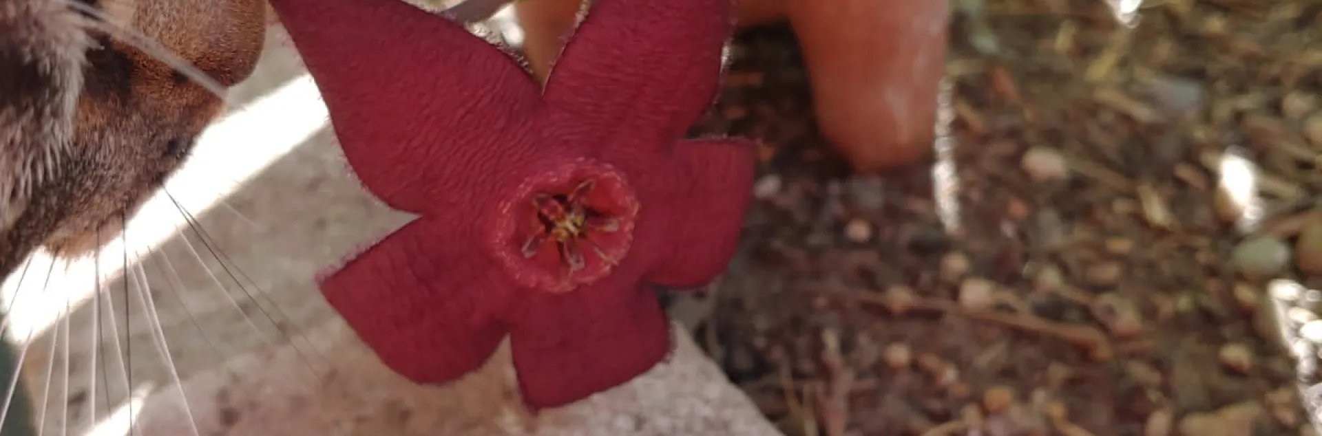 This year I was not the only one to find the flower fascinating. I have this crazy cat, Boomer, who gets into EVERYTHING, knows NO boundaries, and has NO fear. He is everywhere. One minute he is up a tree, the next he is in the barn chasing mice through the hay or standing at the edge of the pool. Boomer even removes tomatoes off the plants just to kick the tomatoes around for fun! Well, he did it. He tore off the Stapelia flower! Boomer threw it in the air a few times just to watch it fly, walked over to his food bowl, with my long-awaited flower in his cute little mouth, and dropped it! That was it! He was done playing with it! I waited a full year, and Boomer ripped it off in 30 seconds!