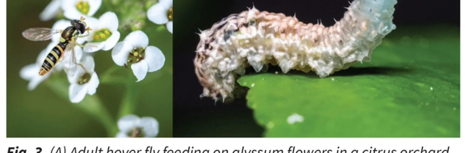 A burgeoning citrus pest, Diaphorina citri, the Asian citrus psyllid is a common meal for the hover fly that is often found hovering around sweet alyssum. It's not the adults that are the adversaries, specifically the hover fly larvae feeds upon the Asian citrus psyllid nymphs. So pairing these two plants together is a great beneficial match to lower the abundance of the asian citrus psyllid which feeds upon the new shoots of all types of citrus trees.