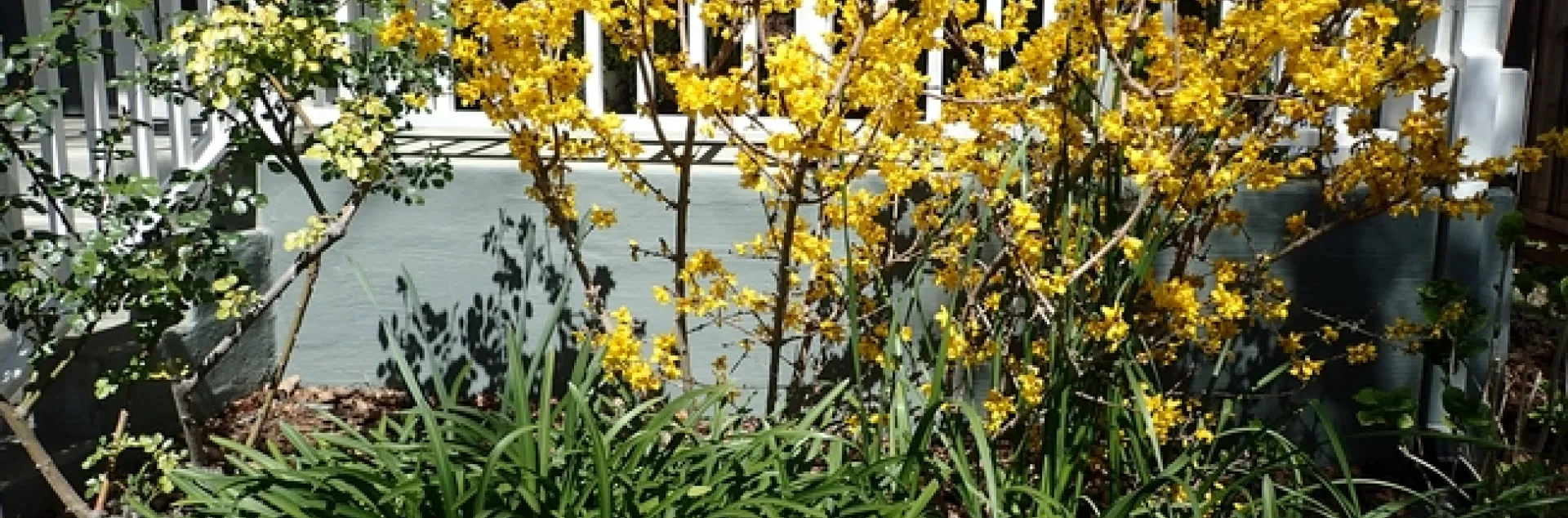 2) Blooming Forsythia hedgerow in front of the raised porch