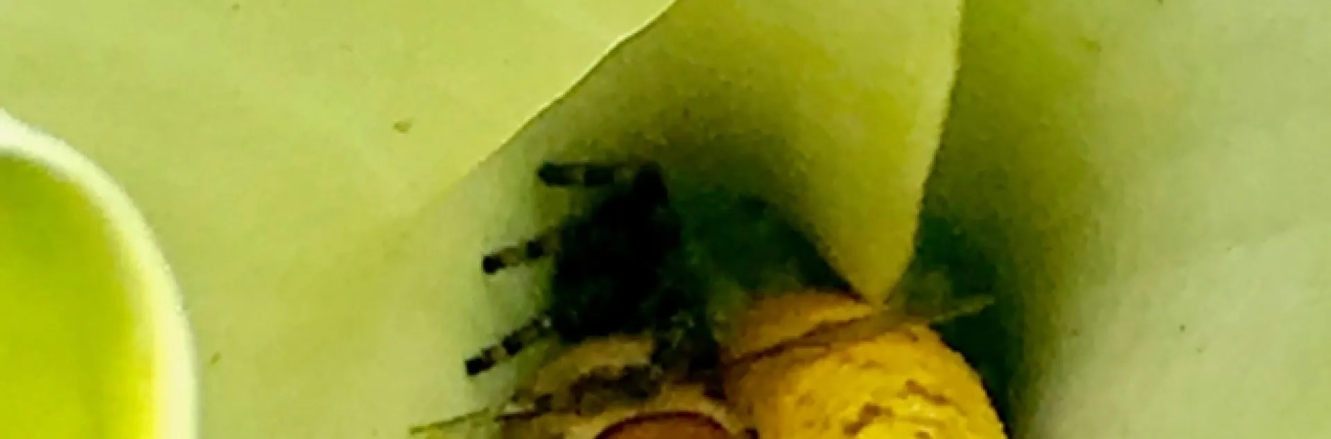 One last task was to pick some Calla ‘Green Goddess' blossoms to refresh an arrangement. As I surveyed the clump to see what I would pick, I noticed one blossom seemed dark in the center. As I leaned in closer I saw a spider and a honey bee, Apis mellifera. The bee wasn't moving but I wasn't sure about the spider. I have seen small dead insects in the center of callas before; I've assumed they have fallen in and couldn't climb back out. I gently inserted a pencil tip into the blossom to see what would happen. The spider was definitely alive and withdrew.
