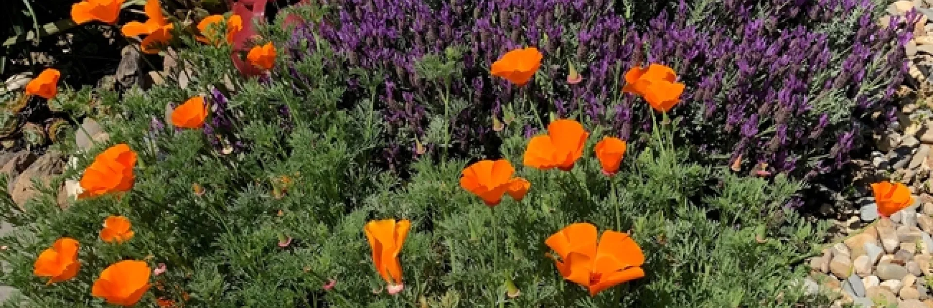 And just for good measure, you can see the California poppy, Eschscholzia californica has once again invaded the garden. It's not purple but plays well with so much purple in the garden. Last year in February I was on my hands and knees pulling out California poppy seedlings. Afterwards, I had to deal with pinched nerves in my lower rib cage, ouch, for a couple of months. Learned my lesson. This year I just let the poppy flourish.