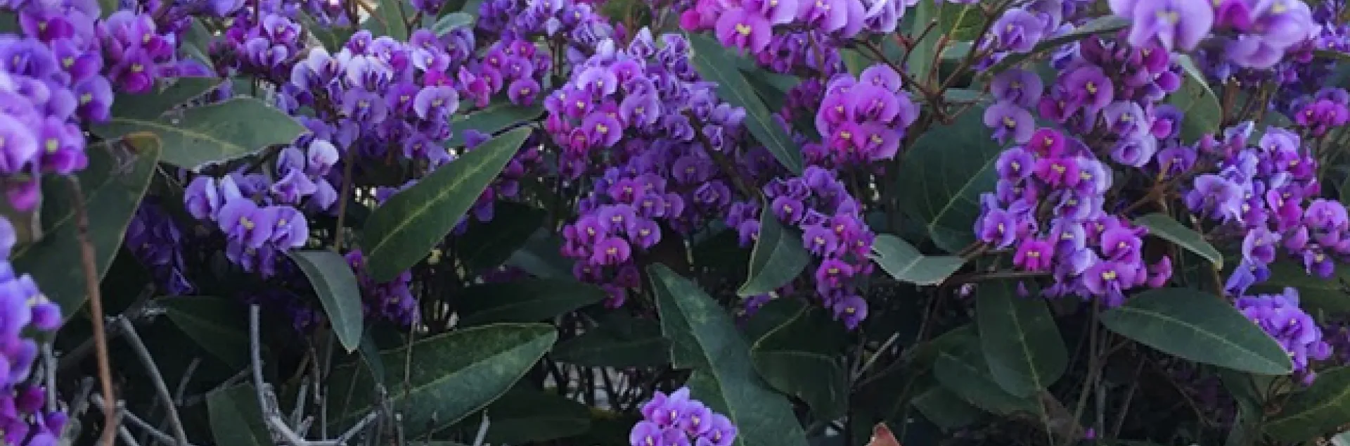 The Happy Wanderer (also known as Coral Pea or Australian Sarsaparilla) is an evergreen vine with beautiful leathery, oblong leaves and tiny flowers in different shades of purple, white or pink. It's zone 9 hardy, prefers partial shade, is drought tolerant and grows well in clay soil, all things that lend to it thriving here in Vacaville. These plants are wonderful climbers that are known for growing up to 20 feet and are absolutely gorgeous grown over archways. I'm so happy to have finally opened my eyes and stopped to smell the flowers, literally and figuratively.