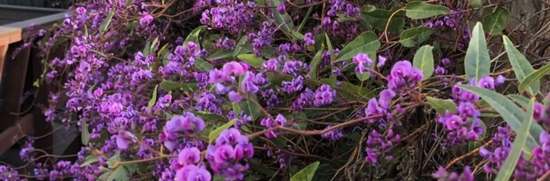 Hardenbergia violacea is an evergreen vine that is native to Australia.  The flowers are shaped like sweet pea flowers with tiny bright green “eyes.” The simple leaves are dark green, narrow, and approximately 2-4” long.  The vine grows at a moderate rate with twining stems to at least 10 feet.  Some sources say that the plant can reach 16 feet.  Regardless, it is vigorous and needs to be placed in an appropriate location for its ultimate size.  The vine needs support for climbing and should be cut back after blooming to prevent tangling.  Selections of Hardenbergia are available in a few other colors, including pink (‘Rosea') and white (‘Icicle').