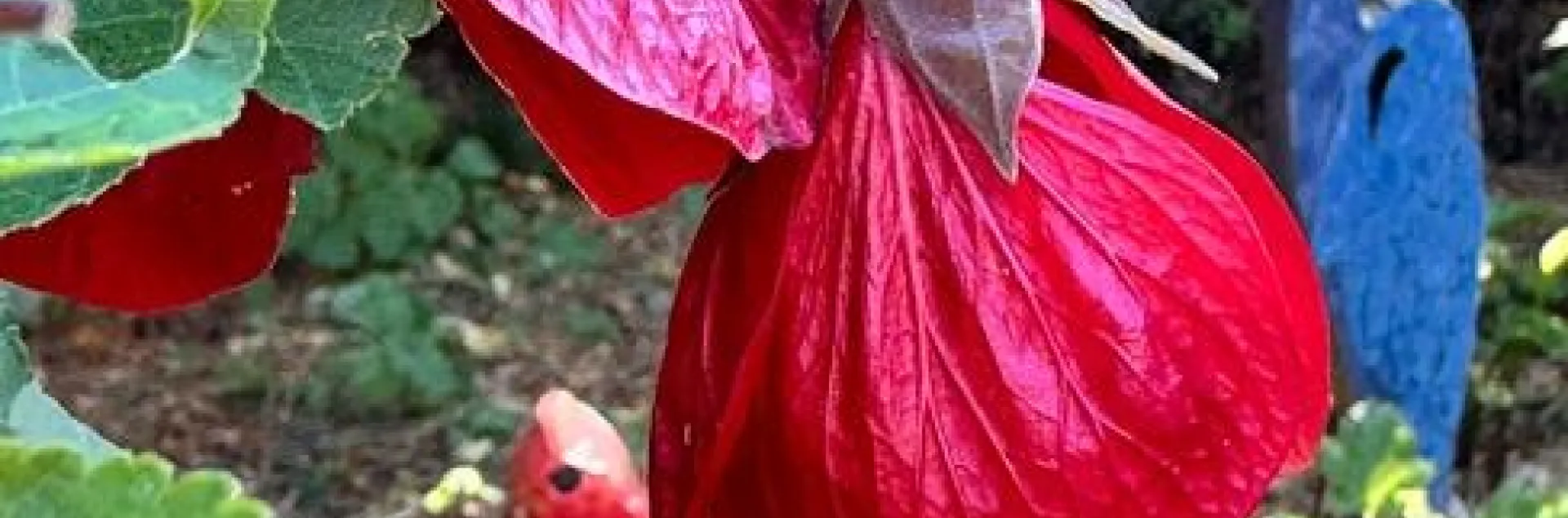 I planted my beautiful Abutilon in a partly shaded, narrow side yard as an espalier with the intent to enliven a narrow, otherwise barren, passageway. And it worked! The plant was lovely, it bloomed well, and it was easy to control in the narrow space. But, oh, the white flies! Every time I walked down the side yard it was like walking through a blizzard. I tried every method of pest control possible, to no avail. (Fortunately, the white flies didn't affect the rest of my yard.) I reluctantly concluded that if the white flies were happy, then the plant was unhappy despite its generally healthy appearance. And I was certainly unhappy with the white fly infestation. I removed the plant. Or so I thought . . . . That plant sent up new stems for over 5 years, and perhaps as long as 8 years. It was a constant battle to remove it for good. The plant couldn't fight whiteflies, but it certainly fought my efforts to eradicate it! Since then, I have longingly eyed other Abutilon plants, but I feared that if I planted another in a different location then I would have to live with it forever. I finally succumbed to temptation recently and planted a small shrub in a container. Thus far, we are both happy and I haven't seen any whiteflies.