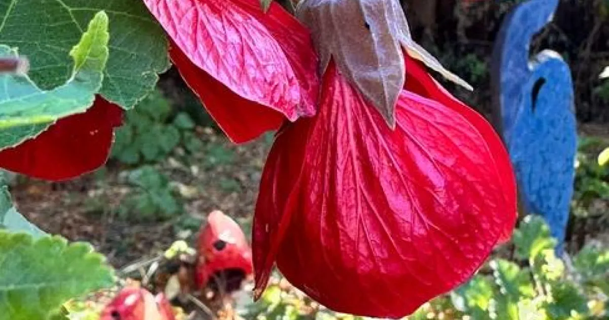 Abutilon. Abutilon hybrids, commonly known as flowering maples, Chinese lanterns, or Chinese bellflower, are a large group of flowering perennials in the Malvaceae family. They are evergreen plants that range in height from 18 inches to 10 feet, providing a wide variety of landscape forms from shrubs to trees. The plants have large, bell-shaped flowers in a variety of mostly warm colors, including yellow, orange, pink, and red. They grow in sun and part shade (in hotter areas).