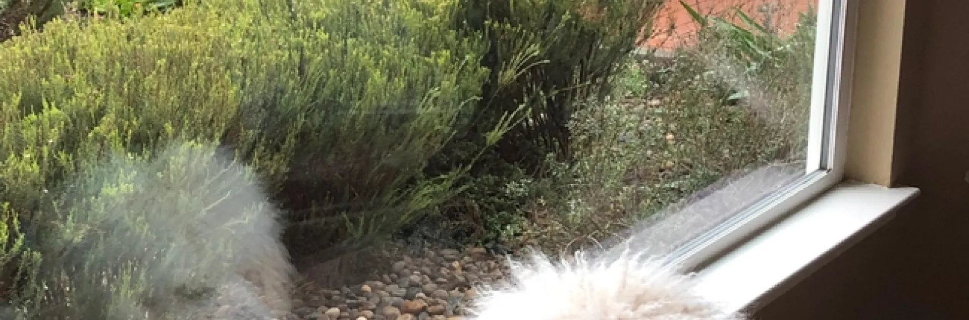 I purchased my honeybush in the era of the Jurassic movies and it has established a home near a small patio and an old retaining wall in my front yard. Sometimes, maybe, lots of times I place my plants so I can view them while sitting in my living room or dining room windows. Today, for example, it has been raining since the early hours of the morning. In these grey overcast raining days my dogs and I like to sit near the front window and read. After my cataract surgery, I need “cheaters” to read pretty much everything. So I read a little, push my specs up, then gaze off to rest my eyes. Over and over my eyes come to rest on my honeybush blowing around in the wind. It is no less than glorious. Later on, in late spring or summer, it will develop red voluptuous flowers that are quite otherworldly.