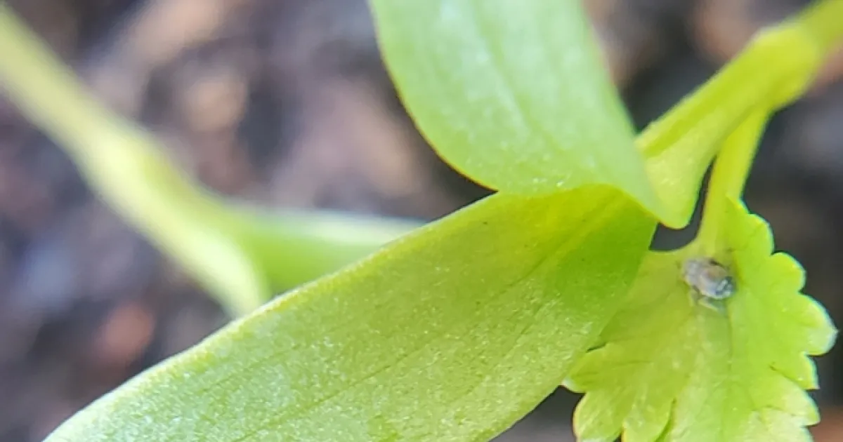 Cilantro 2 cotyledon leaves and 1 true leaf - Photo Paula P.