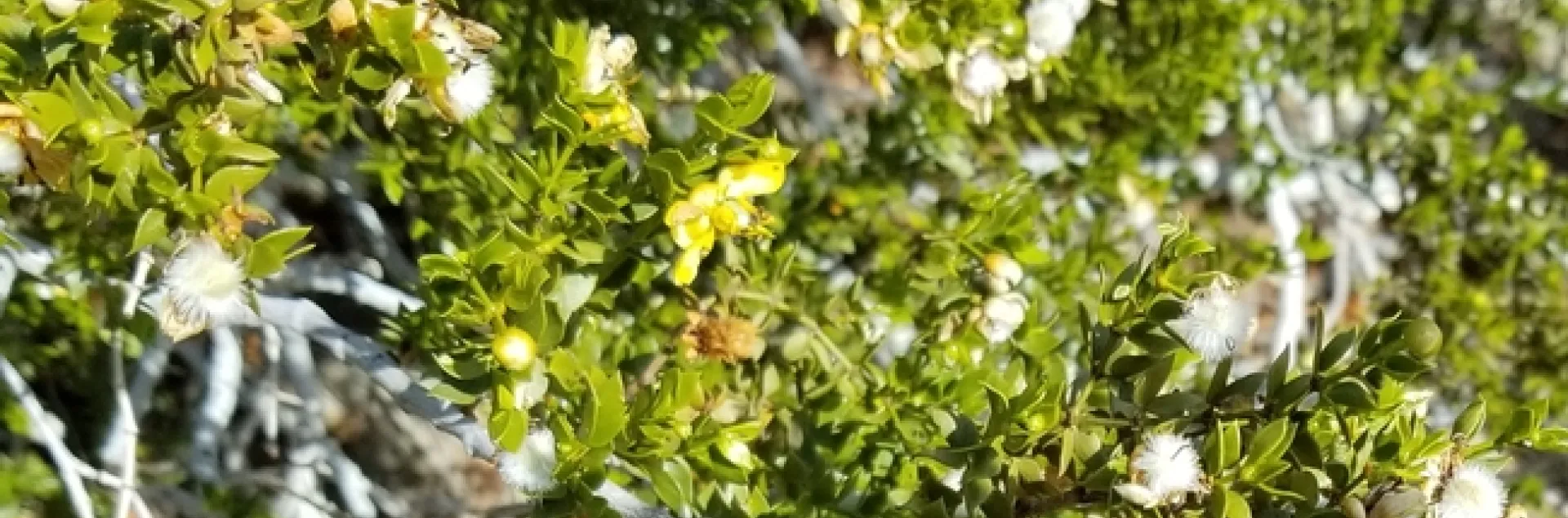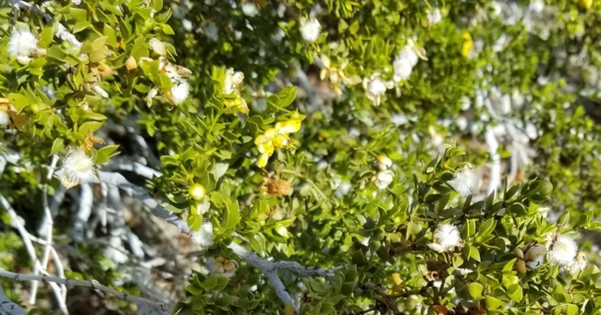 The pictures below are of the creosote bushes (Larrea tridentata) that are all over the place. They bloom small yellow flowers with 5 petals, and as you can see, produce fluffy seeds that disperse with the help of the wind. They grow to about 3 meters tall and have dark green leaves. If wet, they give off a strong odor of creosote.