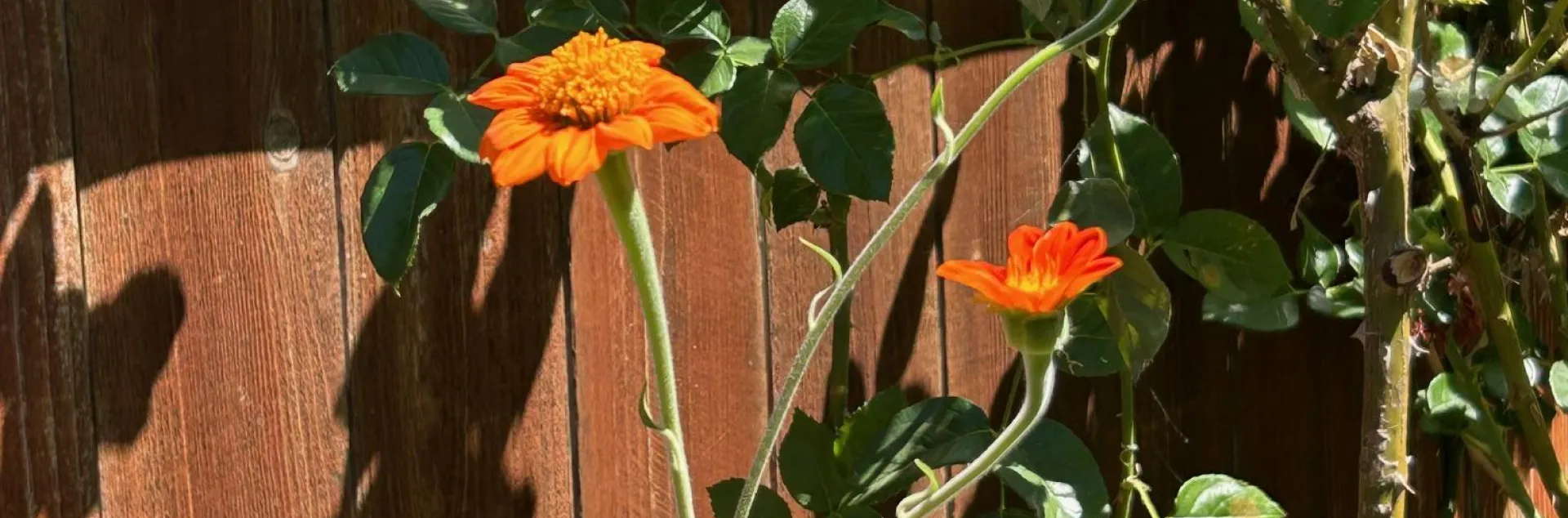 This variety gets to be 4-5 feet tall, so with our winds, I may need to protect them with some stakes. They love full sun and regular water and can stand extreme heat. They bloom better when they are deadheaded, removing the spent blossoms. The stems are hollow and a little delicate. There is a wonderful overview on growing Mexican Sunflowers at hort.extension.wisc.edu/articles/mexican-sunflower-tithonia-rotundifolia/