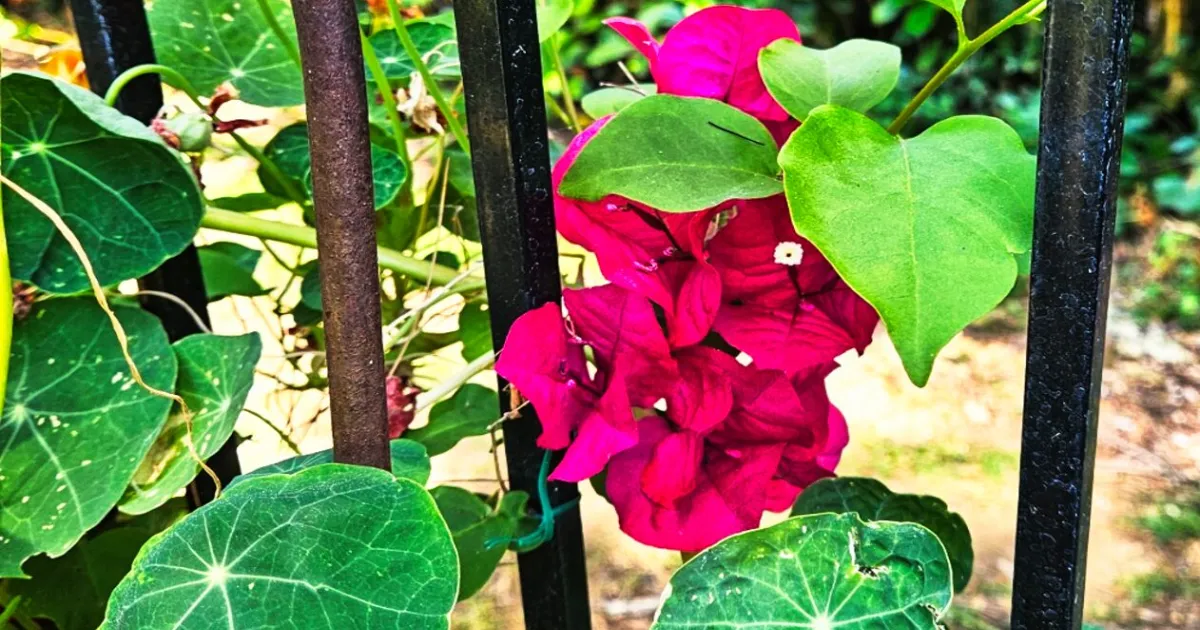 When spring arrived, I was surprised to discover that Nasturtiums were growing and filling the trellis! The old plant must have dropped seeds and is now making a comeback! Not only that, but I also noticed some red flowers popping up among the yellow Nasturtium blooms. It turns out that the old Bougainvillea was also growing back and the combination of colors is beautiful!