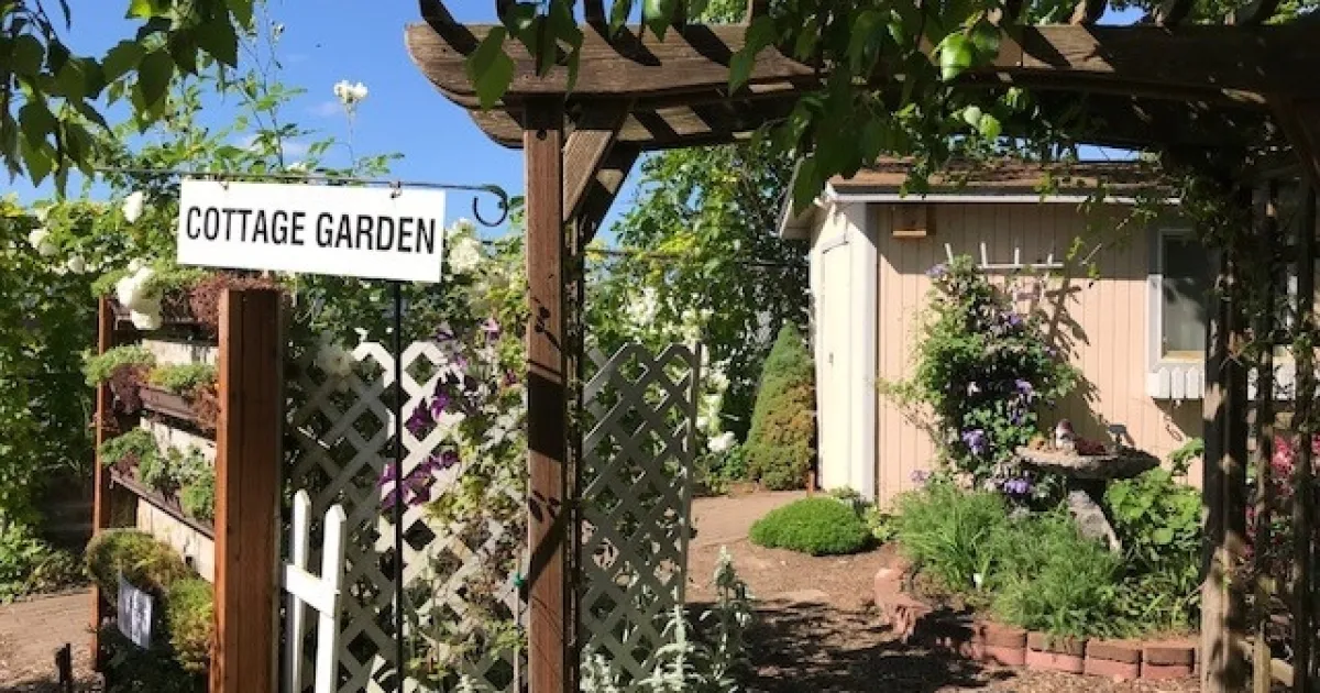 I was visiting Albany, Oregon end of May and early June to help a young friend take care of her newborn twins. The hotel I was staying out was right next to the Linn County Fairgrounds. I went exploring one morning and there on the other side of our hotel parking lot was the Master Gardener Linn County Demonstration Garden and Compost Center. Of course, I had to explore and found a very educational but extremely charming display. From the sign explaining that after hours trespassers would be composted to the fairy garden prominently displayed in their cottage garden area, the garden definitely had a whimsical bent. In addition to the standard fruit and vegetable, herb, native, and shade gardens, there were pollinator areas, an edible flower garden spilling out of a shopping cart and another garden planted in an irrigation tub that was demonstrating how colorful a foliage garden could be. There was a permanent exhibition of the different kinds of composting plus demonstration of Hill Bed Culture and planting in leaf mold. There was a covered patio with picnic tables and benches for lectures and seasonal posters.