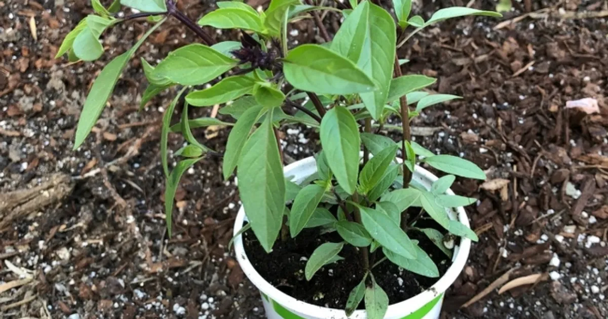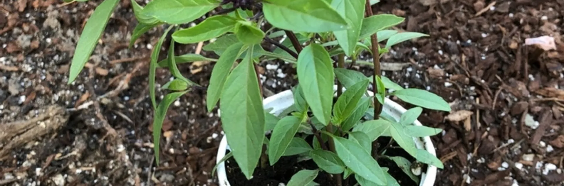 In addition to sweet basil, this year I am going to try Thai basil in the garden. It has quite a pungent flavor so should do well in curries. Ocimum basilicum thyrsiflora, Thai basil is one of the many varieties of Ocimum basilicum, or sweet basil. Basil is a summer annual herb with leaves of various shades of green and purple. They prefer full sun and moist well draining soil. Pinch out the flowers to keep the plant growing. In past years my basil plants have lasted until Thanksgiving. I plant my basil within a tomato cage. The cage helps the plant grow upright with just enough support to allow the branches to separate for air circulation and it keeps my dogs from knocking it over.