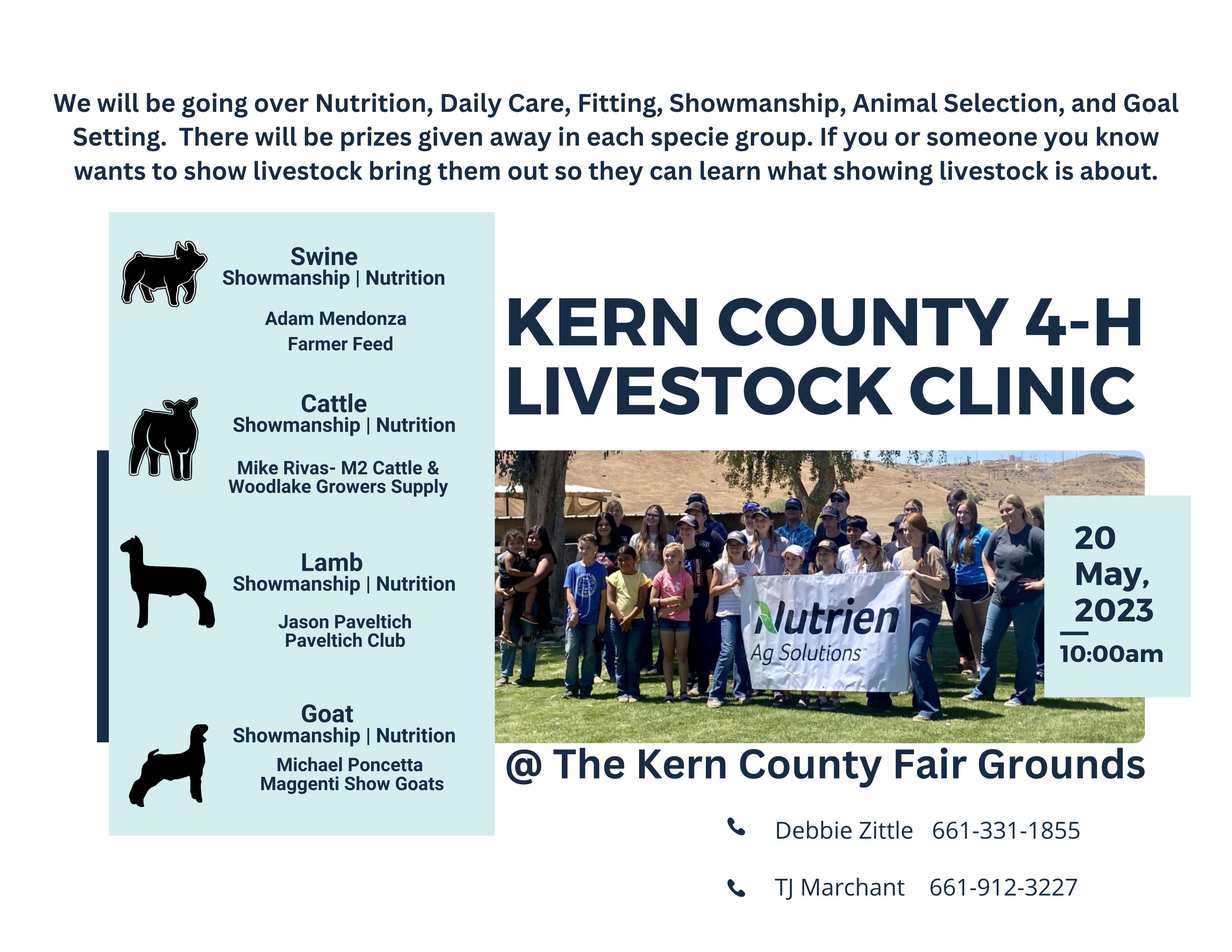 May 8, 2023 Print Livestock Clinic at the Kern County FairgroundsSaturday, May 20th at 10:00amSee attached for detailsPlease note-not a UCANR sanctioned eventDocuments Kern County 4-H Livestock Clinic 712983