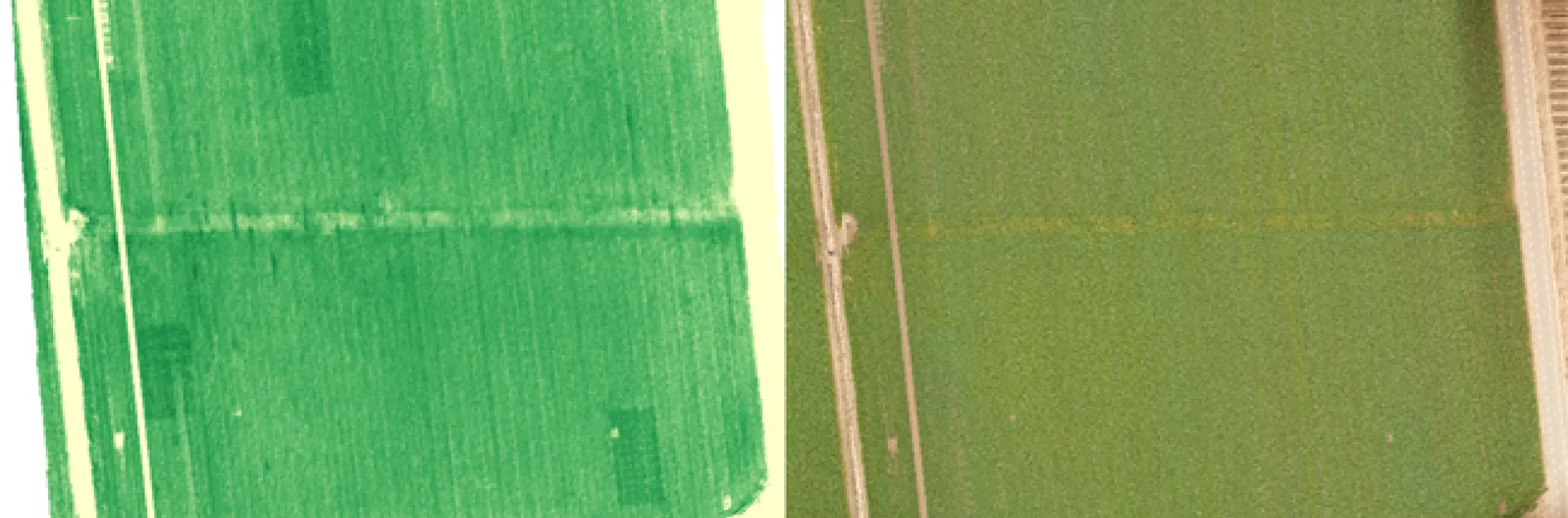 Figure 1. A field in Solano County where three N-rich reference strips are visible at tillering using a canopy reflectance measurement (left), but not visible to the naked eye (right).