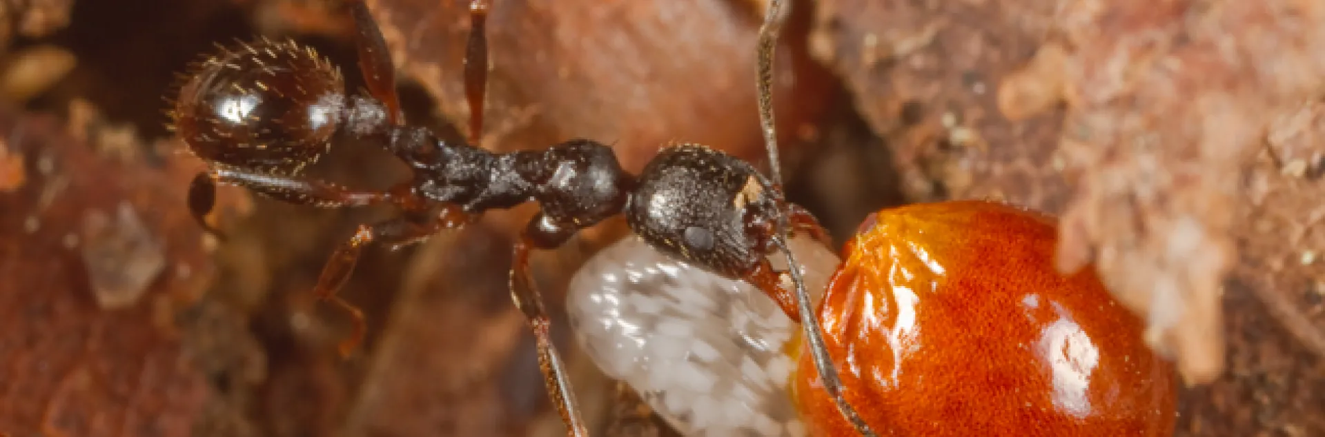 Elaiosome, e-lay-o-zome, n. (Greek: elaio = oil + soma = body) meaning ‘oil body'. Some plant seeds have an attached structure that is filled with lipids and proteins. This oily knob attracts ants that carry the seeds back to their colony to feed the babies and adults. When the structure has been cleared the remaining seed is thrown in their garbage heap. This results in the seeds germinating in a rich compost pile away from the parent plant. It is an ingenious seed dispersal mechanism that is symbiotic with maintaining ant colonies and their health.