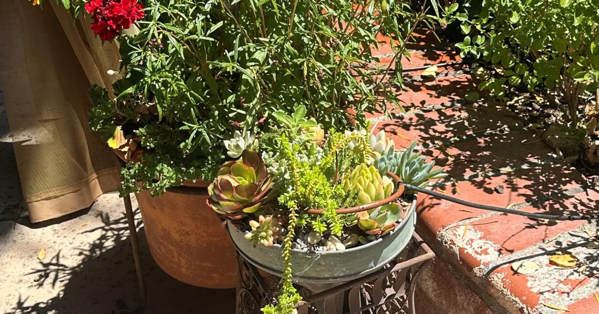 Placing pots on the hardscape brings plantings into the patio. The succulents are planted in a vintage funnel. Photo: Dot Zanotti Ingels