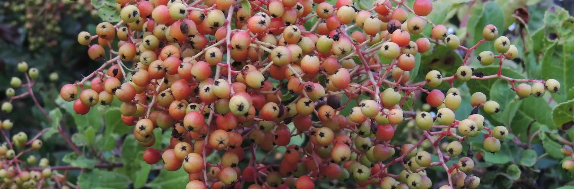 Rhamnus californica, or Coffeeberry, is widespread in coastal California but also happy inland, and tolerates both sun, where it will grow into a dense mounding bush, and shade, which will result in a more sprawling plant. Tiny spring flowers attract beneficial insects and pollinators. The berries start out limey green, ripen to red, and then turn almost black. Birds and small mammals feast on them.