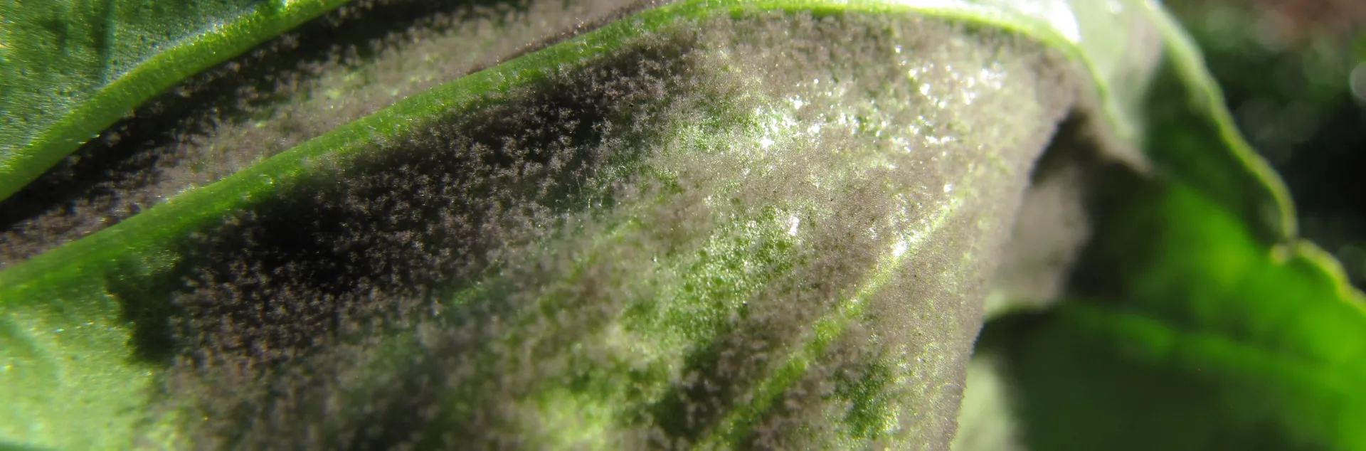 Downy mildews, including Peronospora and Plasmopara spp., are pathogenic water molds (oomycetes) that primarily damage foliage. Hosts include cane berries, roses, various herbaceous ornamentals, and many fruit, grain, and vegetable crops.