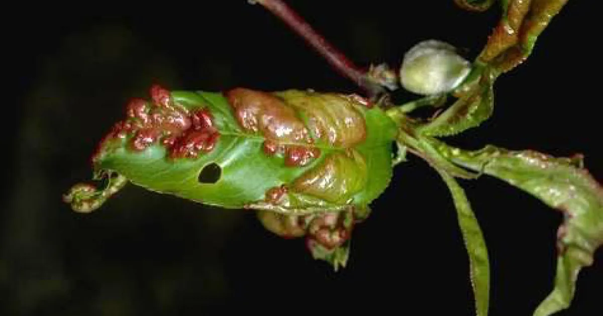 First appears in spring as reddish areas on developing leaves. Areas become thickened and puckered, causing leaves to curl and severely distort.