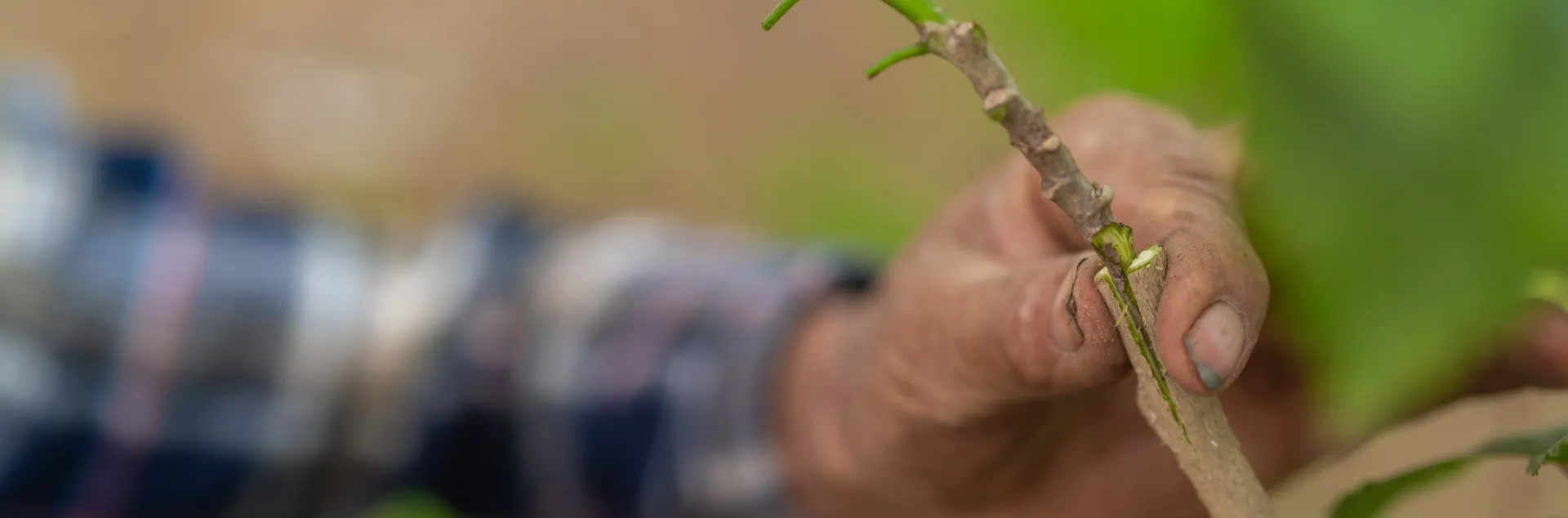 To create a graft, cut a short section of a tree shoot and insert it into the limb or trunk of a seedling tree. To ensure the graft union heals properly, you must tightly hold the two parts together and secure:
