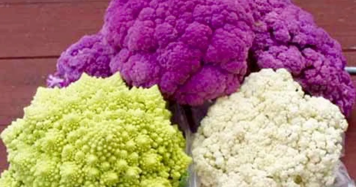 Cauliflowers Graffiti (purple), Romanesco (green), and Snowball (white)